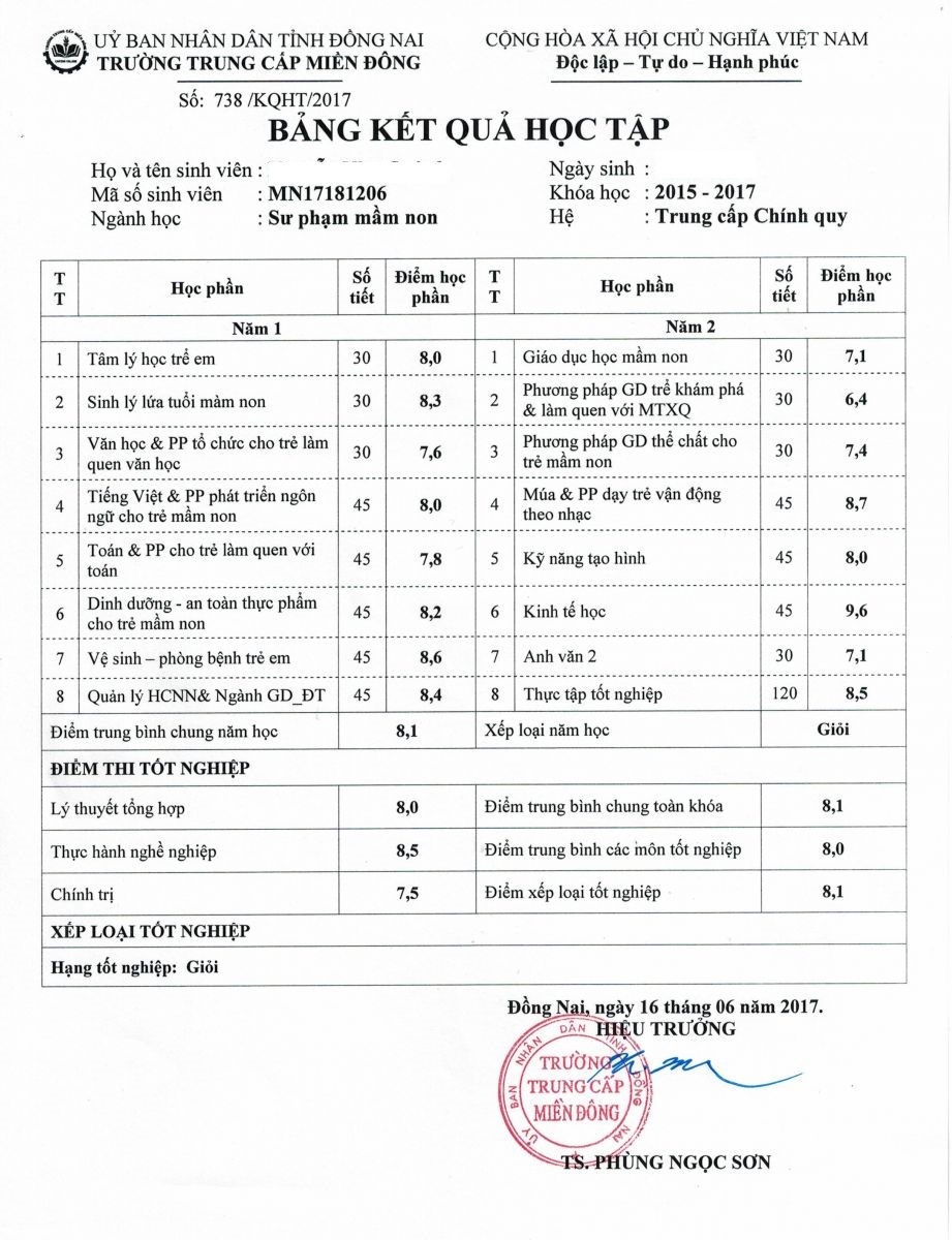 Bảng điểm trung cấp sư phạm Mầm non - Trung cấp Miền Đông